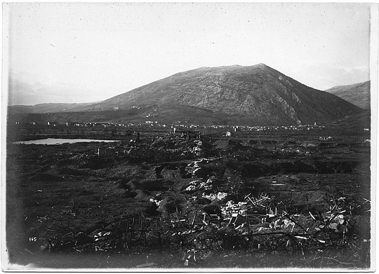 Pogled na Sabotin preko goriške ravnice, na kateri je zraslo mesto Nova Gorica.